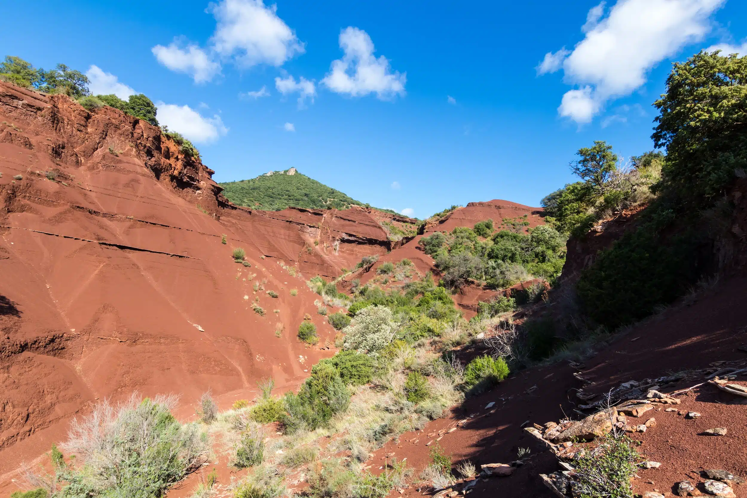 Dès les premiers pas dans le Canyon du Diable, le spectacle est saisissant. En effet, le sol est rouge, et ça, ce n’est déjà pas banal. Cette couleur si particulière provient de la ruffe, une roche sédimentaire vieille de plus de 250 millions d’années, formée durant le Permien.